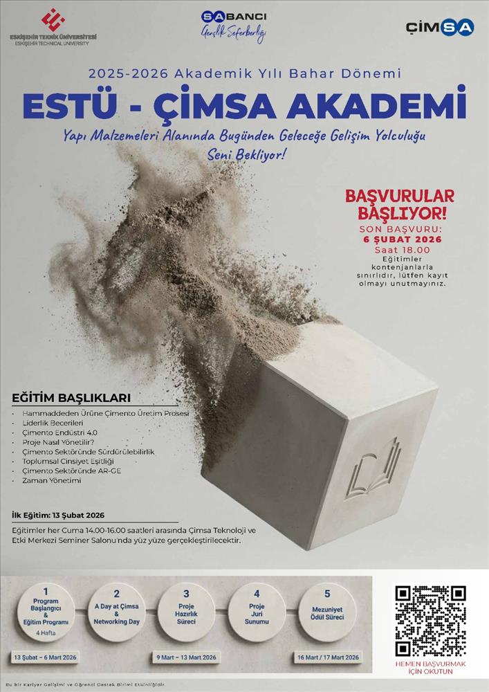 Öğrencilerimizi program boyunca ÇİMSA profesyonelleriyle bir araya getiren ESTÜ- ÇİMSA Teknoloji ve Etki Merkezi Akademi Programı 13 Şubat 2026 Cuma günü saat 14:00’de başlayacaktır. Farklı teknik konularda ve öğrencilerimizi profesyonel yaşama hazırlamaya yönelik eğitimler ile devam edecek olan program, ÇİMSA Eskişehir Çimento Fabrikasına düzenlenecek olan Teknik Gezi ile son bulacaktır.