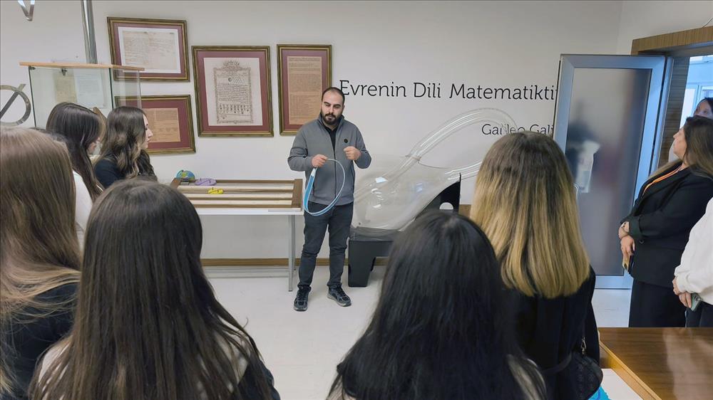 Programın devamında Araş. Gör. Buse ÖZALP, Zooloji Koleksiyon Bölümü’nde yer alan çeşitli hayvanlara ait iskelet, kafatası, kürk ve fosil örneklerini tanıtarak öğrencilerin merakını artırdı. Etkinliğin son durağı olan Matematik Noktası ise matematiği soyut bir ders olmaktan çıkarıp modeller ve ispatlar aracılığıyla somutlaştıran yapısıyla öğrencilerden yoğun ilgi gördü. Matematik Bölümü emekli öğretim üyesi ve bu alanın kurulmasına önemli katkılarda bulunan Prof. Dr. Mehmet ÜREYEN, tarihî matematik kitapları, hesap araçları ve modeller üzerinden matematiğin hem tarihsel gelişimini hem de günlük yaşamdaki karşılığını anlatarak öğrencilerin ilgisini pekiştirdi.