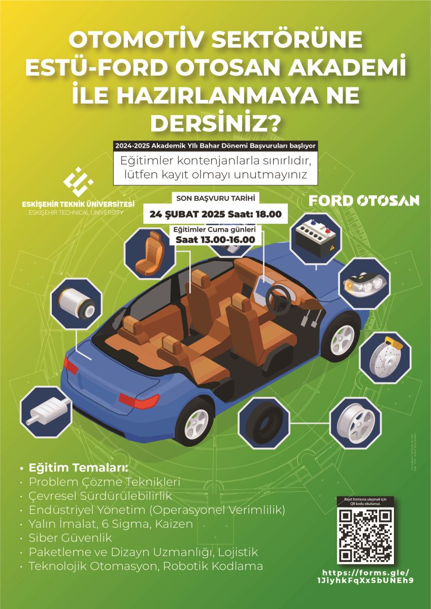 2019 yılından itibaren üniversitemiz ve Ford Otosan Eskişehir Fabrikası arasındaki iş birliğiyle sürdürülmekte olan ESTÜ-FORD OTOSAN AKADEMİ 2024-2025 Akademik Yılı Bahar Dönemi programı başlıyor!