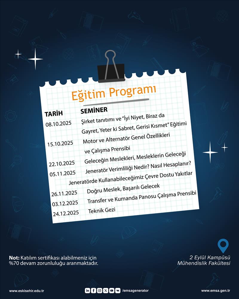 Eskişehir Teknik Üniversitesi (ESTÜ) ile EMSA Jeneratör iş birliğinde düzenlenen ESTÜ-EMSA Jeneratör Akademi Programı, 2025-2026 Güz Döneminde enerji sektörüne ilgi duyan öğrenciler için başlıyor.