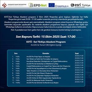 Eskişehir Teknik Üniversitesi ve Esri Türkiye iş birliğiyle, EPD-Net projesi kapsamında düzenlenen Esri Türkiye Akademi Programı başvuruları başlamıştır.