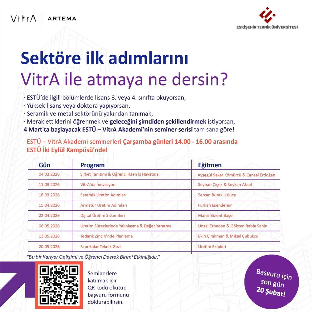 Öğrencilerimiz, program boyunca VitrA profesyonelleriyle sektör gereklerinden iş hayatına ilk adımda edinilmesi gereken önemli ipuçlarına kadar pek çok konuyu öğrenme imkânı yakalayacaklar. 04.03.2024 Çarşamba günü saat 14:00’te “Şirket Tenıtımı & Öğrencilikten İş Hayatına” semineri ile başlayacak olan program, sonraki haftalarda farklı konular üzerine düzenlenecek olan seminerler ile devam edecektir. Ölçme değerlendirme süreçleri sonucunda ESTÜ-VitrA Akademi programına katılan, 3. ve 4. sınıf ile Yüksek Lisans, Doktora öğrencileri, staj süreçlerine dahil edilerek, kendilerine istihdam olanağı sunulabilecektir.