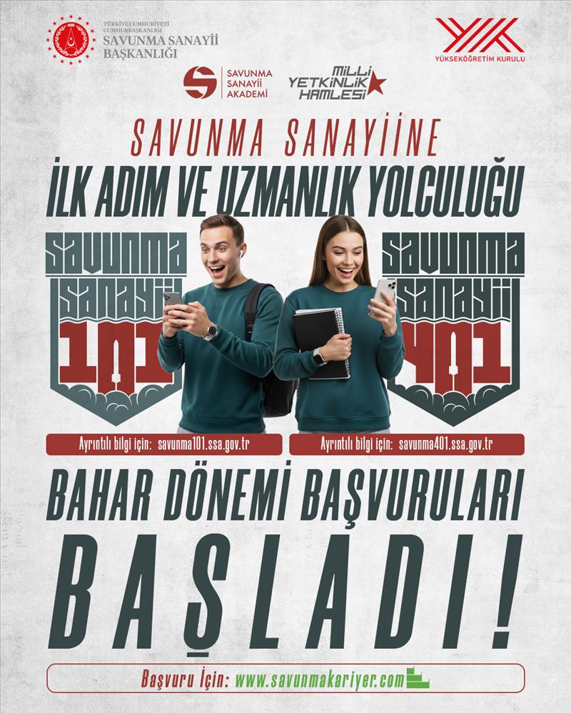 Milli Yetkinlik Hamlesi kapsamında, üniversite öğrencilerine yönelik olarak yürütülen Savunma Sanayii 101, 102, 401 ve 402 Eğitim Programlarının 2025 Bahar Dönemi başvuruları başlamıştır.