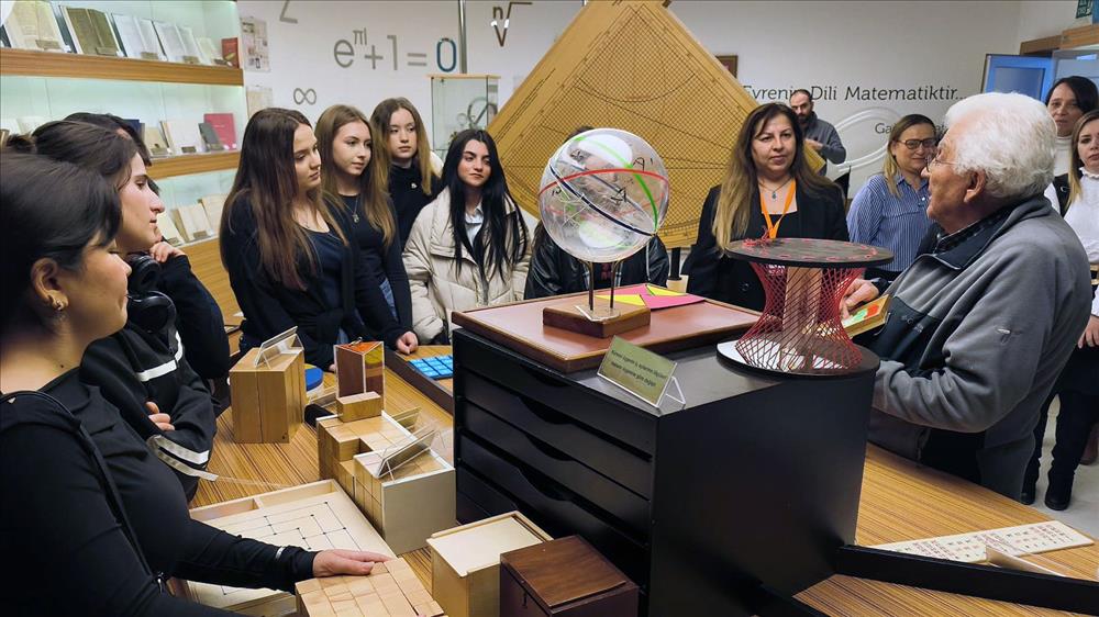 Programın devamında Araş. Gör. Buse ÖZALP, Zooloji Koleksiyon Bölümü’nde yer alan çeşitli hayvanlara ait iskelet, kafatası, kürk ve fosil örneklerini tanıtarak öğrencilerin merakını artırdı. Etkinliğin son durağı olan Matematik Noktası ise matematiği soyut bir ders olmaktan çıkarıp modeller ve ispatlar aracılığıyla somutlaştıran yapısıyla öğrencilerden yoğun ilgi gördü. Matematik Bölümü emekli öğretim üyesi ve bu alanın kurulmasına önemli katkılarda bulunan Prof. Dr. Mehmet ÜREYEN, tarihî matematik kitapları, hesap araçları ve modeller üzerinden matematiğin hem tarihsel gelişimini hem de günlük yaşamdaki karşılığını anlatarak öğrencilerin ilgisini pekiştirdi.